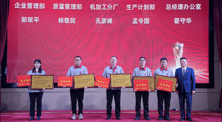 先进集体和先进个人代表依次上台发言。其中机加工分厂孔彦峰(先进分厂代表),生产计划部孟令国、质量管理部代继强(先进部室代表),锻造分厂谢昌军、机加工分厂李洪安(先进班组代表)等来自各条战线的优秀代表,结合自身岗位分享了奋斗心得。