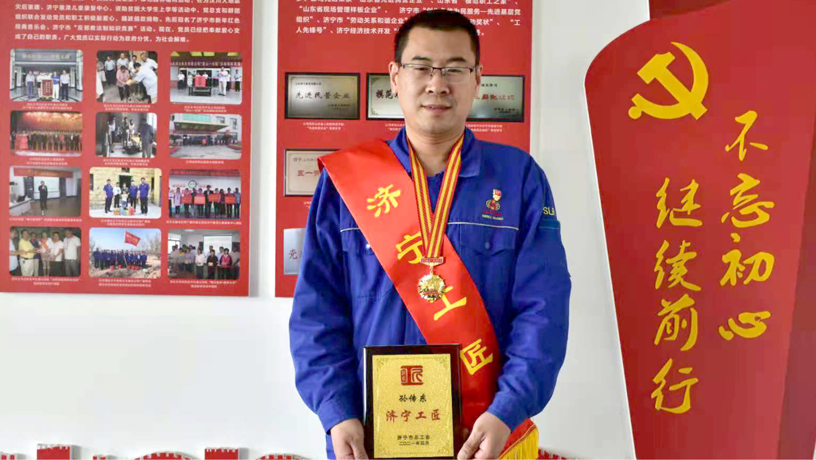 由于出色表现,孙传东同志先后多次被公司授予 “劳动模范”、“先进生产工作者”、“优秀共产党员”、“科技创新能手”等称号;2018年,获得山东省五金行业“金牌工匠”,济宁经开区“优秀共产党员”等称号;2019年,被山东轻工集团企业联社评为“首席技师”,荣获山东省第八届五金技能大赛锻造组“第一名”、“山东省技术能手”等称号;2021年,被山东省五金衡器工业协会评为“特级技师”,荣获济宁市“五一”劳动奖章、“济宁工匠”、山东省轻纺行业金牌职工等称号;同年,孙传东同志参加山东省企业科技创新,80~100级安全吊钩技术创新获“二等奖”。