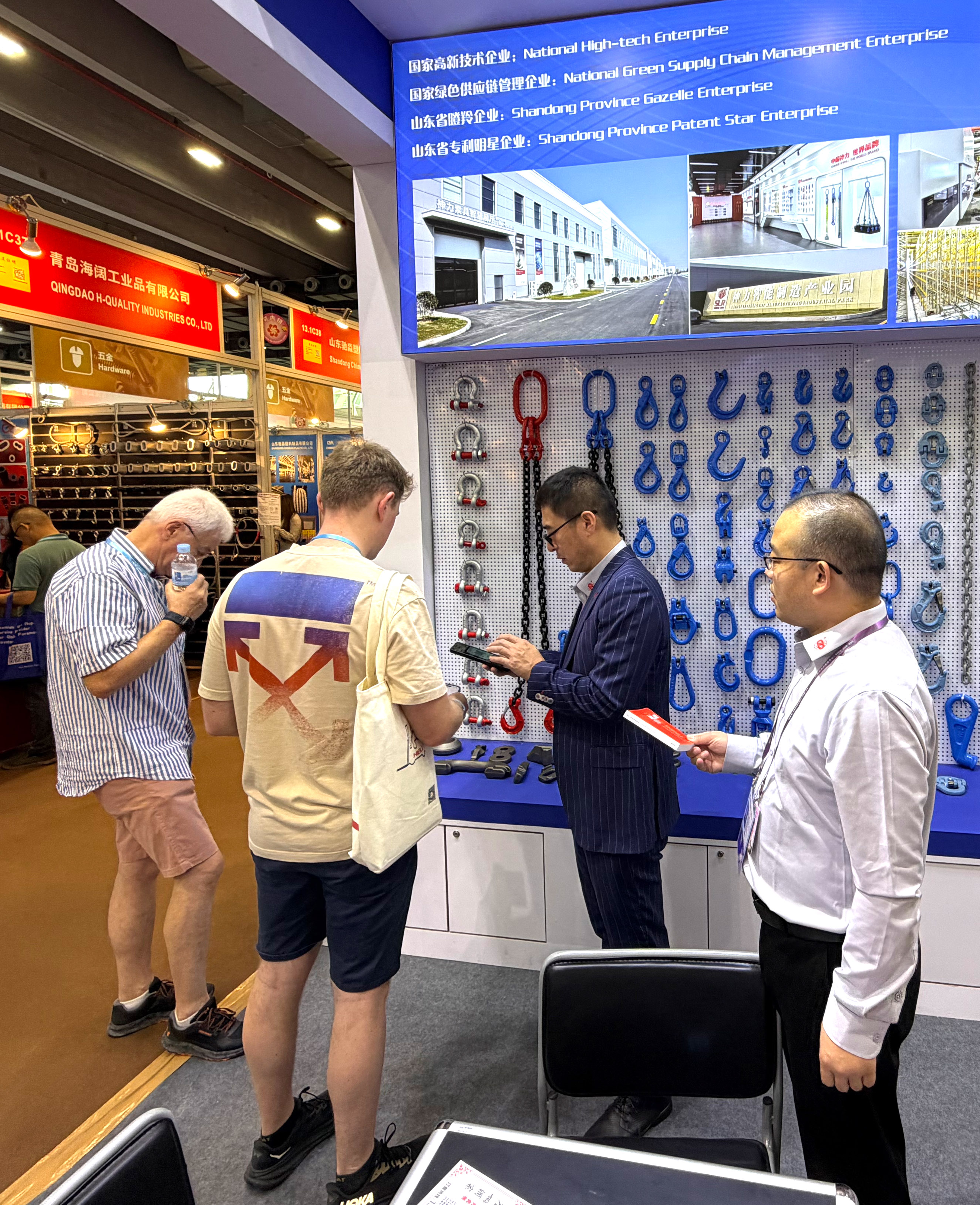 本次广交会上,神力索具创新采用“制造+贸易”双平台联动模式。山东神力索具有限公司带来全产业链高端产品,从高强度起重链条到智能吊装系统,展现深度制造能力;从深海工程专用索具到航空航天高精度配件,每一件产品都凝聚着神力索具对卓越质量的极致追求。山东神力进出口有限公司则依托全球化营销网络,实现“前端市场反馈”与“后端研发制造”的无缝对接。这种上下游协同的参展模式,让客户在现场即可体验从产品定制到跨境交付的一站式服务。